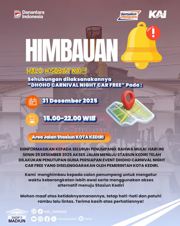 PT Kereta Api Indonesia (Persero) Daerah Operasi 7 Madiun mengimbau para pelanggan kereta api yang akan berangkat dari Stasiun Kediri pada Rabu malam, 31 Desember 2025, untuk datang lebih awal ke stasiun, minimal 1 (satu) jam sebelum jadwal keberangkatan kereta api.